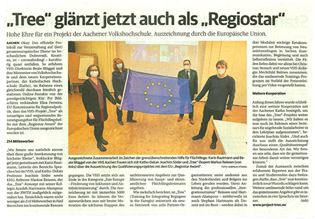 Verleihung des ‚Regiostar Award‘ durch die Europäische Kommission für das Projekt TREE (Training for integration refugees in the euregio) - 1. Preis ‚Fair Europe - Förderung von Inklusion und Antidiskriminierung‘ - Federführung für die Konzeption und die Trainings mit Haupt- und Ehrenamtlichen auf der deutschen Seite